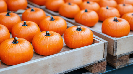 A collection of fresh organic pumpkins arranged neatly on wooden crates, ideal for autumn displays. Perfect for markets, decorations, or harvest themes.