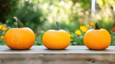 Three pumpkins on a wooden table with a blurred background of nature and sunlight, providing copy space for text, suitable for a banner design. --chaos 30 --ar 16:9 --v 6.1 Job ID: 5380b2cd-1462-4e57-a139-98df1f7406f1