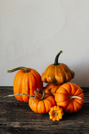 Autumn pumpkin background. A rich harvest of small pumpkins on a wooden background. The concept of a Halloween or Thanksgiving holiday.