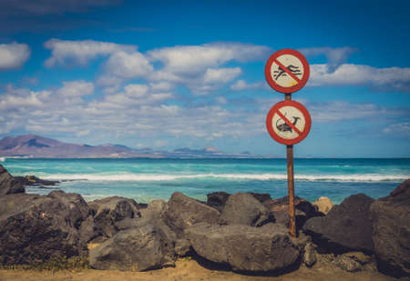 No swimming, no fishing signs on the coast in Corralejo, Fuerteventura, Canary Islands, Spain