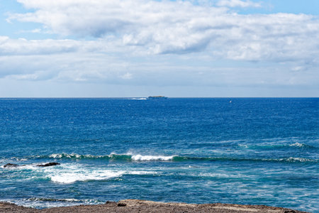 Sea swell and ferry - ARMAS ferry going from Lanzarote to Fuerteventura, large waves on the foreground