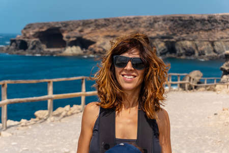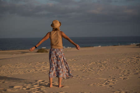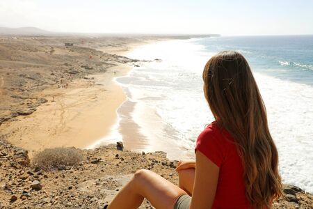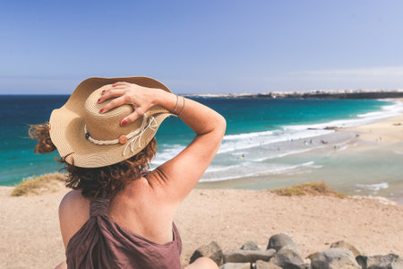 Back view of a female tourist looking the tropical panorama in a windy day. Amazing ocean beach in Fuerteventura Spain. Beautiful girl with straw hat. Travel, vacation, happiness and carefree concept