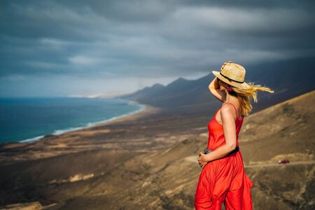Beautiful young woman with red vibrant dress looking at rocky mountains and beach of Cofete in Fuerteventura