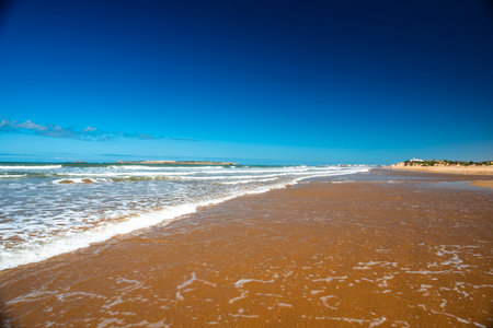 Sandy beach with a water of Atlantic ocean during the high tide. Small waves with white foam. Bright blue sky. Essaouira, Morocco.