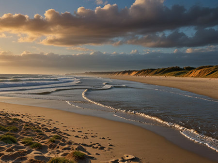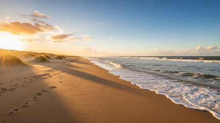 The captures a sunset on a tranquil sandy beach. Golden sun rays pierce through scattered clouds, casting a warm glow and long shadows across the sand. Gentle waves lap at the shoreline, creating a foamy white edge. Footprints are visible on the sand, hinting at a peaceful presence. Grassy dunes line the edge of the beach, leading towards the distant horizon where the sky meets the sea.