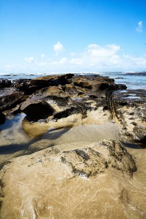 Sunny day on rocky Coast of Chintza Beach with big waves and clear blue sky