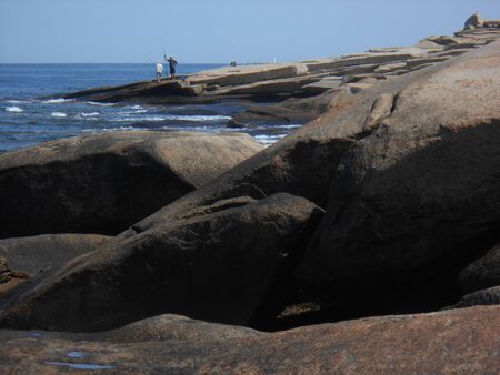 Large rocks at seashore with fishermen in distance