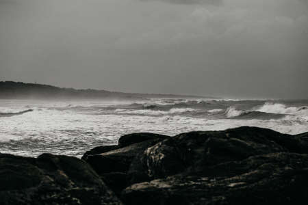 Waves hit the rocks on a beach in Itanhaem