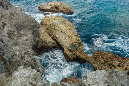 Seashore with large weathered boulders. Rocky shore with blue water. Mediterranean Sea coast, Cyprus.