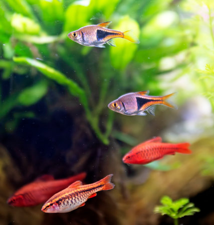 Beautiful freshwater fish belonging to the tetras family in an aquarium planted with elodea