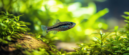 Close-up of a tiny fish darting among lush green aquatic plants in an aquarium, capturing the serene underwater beauty in Chonburi, Thailand