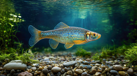 A fish swimming freely through a rocky and gravely aquatic environment, capturing the natural texture and clarity of water with a focus on underwater life.