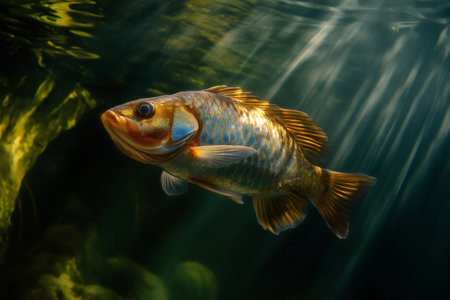 Beautiful golden fish swimming upstream in dark water with sunbeams shining through the surface, creating a magical atmosphere