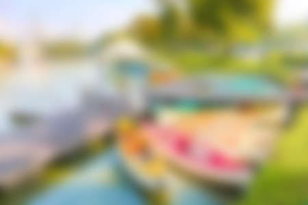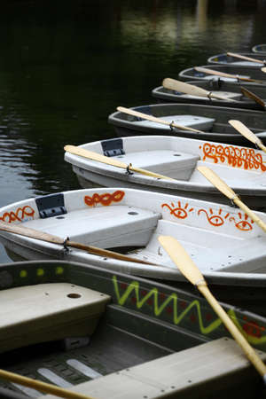 Wooden pleasure rowboat at the pier of a lake for rent. Municipal city park. Hamburg