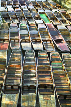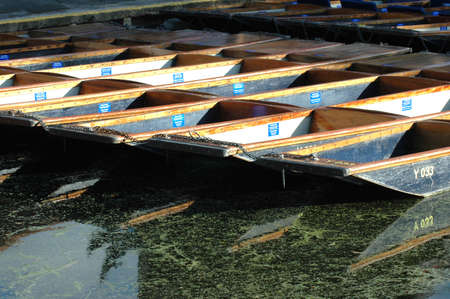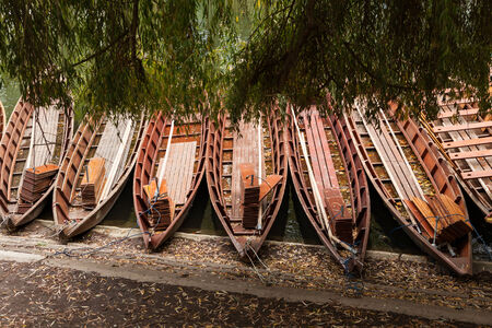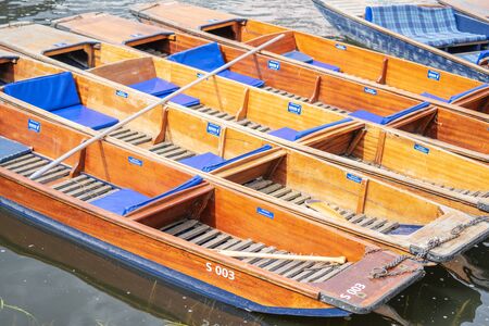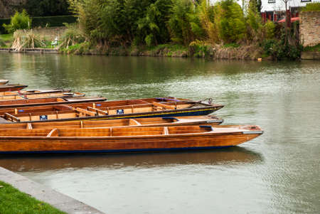 Punt flat bottom river wooden boats on river Cam waters in Cambridge