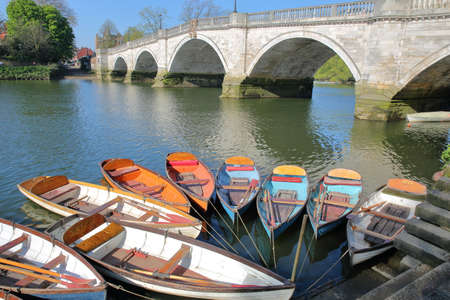 LONDON, UK - APRIL 9, 2017: Colorful boats on the river Thames in Richmond (Southwest London) with Richmond Bridge in the background