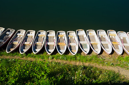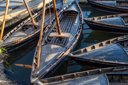 Wooden rowboats with oars inside, moored at the Thames riverside