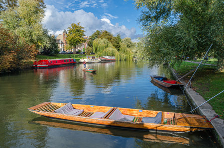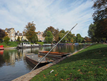 CAMBRIDGE, UK - OCTOBER 11, 2014: Punting on the River Cam in Cambridge, England. A punt is a flat-bottomed boat with a square-cut bow, designed for use in small rivers and shallow water. The punter propels the punt by pushing against the river bed with a