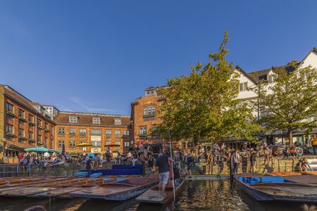 Cambridge, UK - July 16, 2021: River Cam and Punting boats with tourists