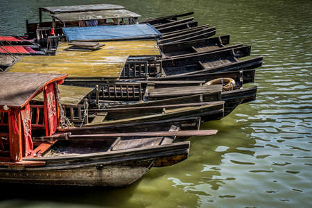 Feng Huang, China - August 2019 : Close up of old historic wooden tourist boats moored on the riverbank of Tuo river, flowing through the centre of Fenghuang Old Town