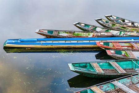 Above view of colored boats docked. Red Lake is a natural dam lake in Romania located in the north-east where you can still see the tree stumps.