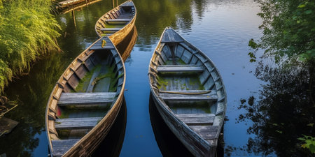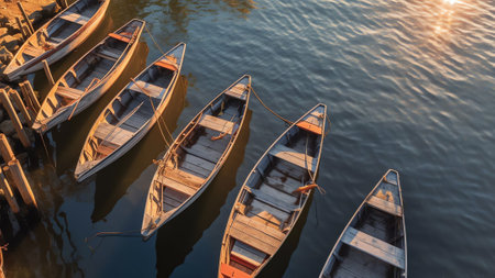 aerial view of canoes lined up on a tranquil lakeshore, created with generative ai