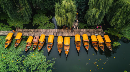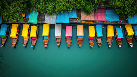 A stunning aerial view of colorful boats resting alongside a tranquil riverbank surrounded by lush greenery. Perfect for travel and nature themes.