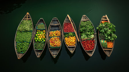Aerial view of small wooden boats filled with vibrant fruits and vegetables, showcasing local market life on a serene aqua river. Ideal for highlighting agriculture and community.