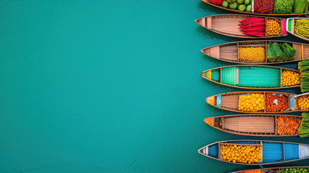 Vibrant floating market in Thailand with colorful boats filled with fresh produce. No people, copy space.