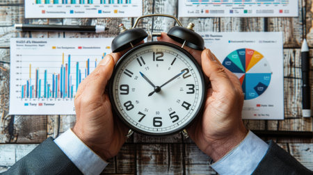 Businessman Holding Clock Over Financial Documents for Time Management and Productivity Concept