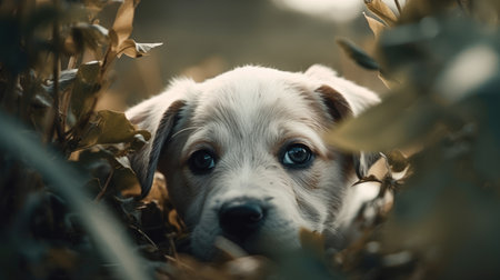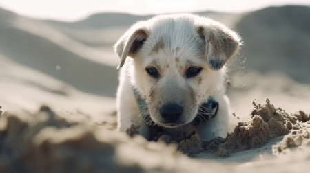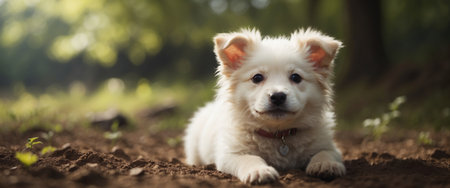 AI Generated. Adorable fluffy white puppy having a peaceful time lounging in the earthy ground