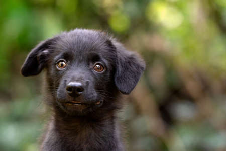 Portrait of a cute dog in the garden. Selective focus.