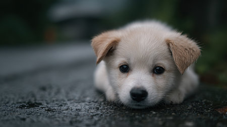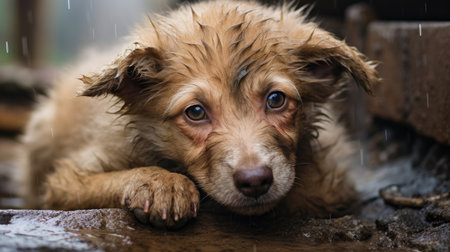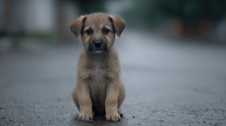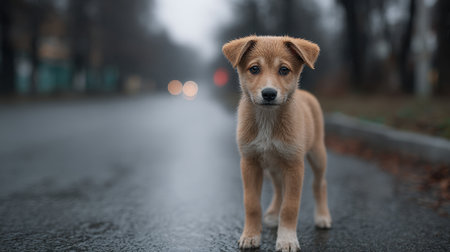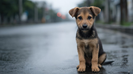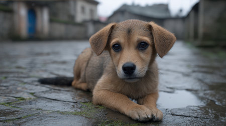 A charming young puppy sits alone on a rainy street, capturing the essence of innocence and playfulness in a quiet urban setting. The wet pavement reflects the surrounding environment, enhancing the mood of solitude and tranquility.