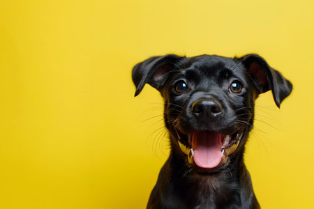 Portrait smiling black dog on yellow background