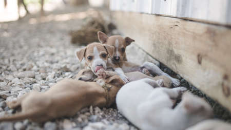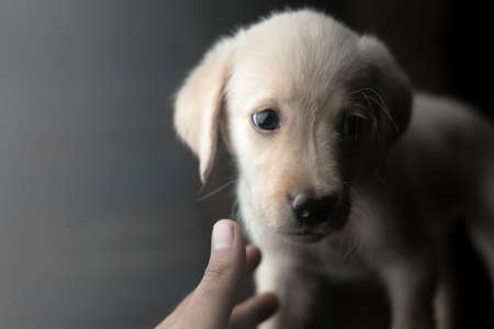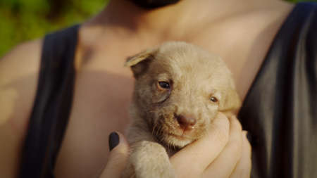 A cute sleepy brown puppy licking his mouth and leaning head on female hands of his new owner. Adopted puppy feels good and comfortable, trusting his new friend. Adorable baby pup biting girls finger