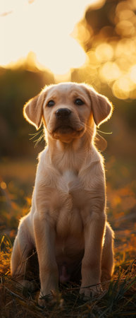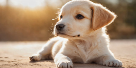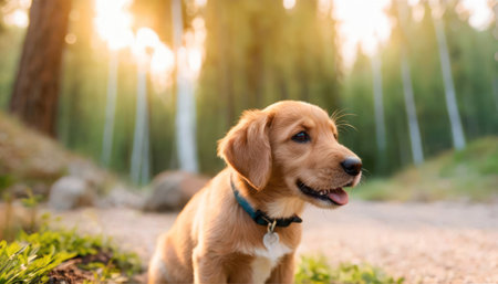 Cute puppy with bright eyes and cheerful expression enjoys a sunny day outdoors in the golden light