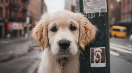 A touching scene featuring a lost dog poster hanging on a pole in a rainy urban environment. An adorable puppy gazes into the camera, evoking emotions of hope and compassion.