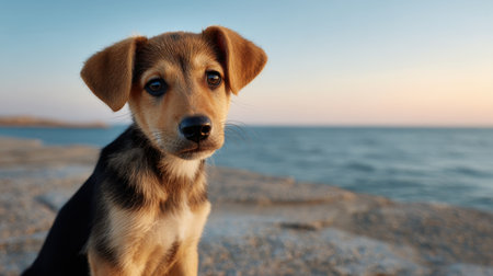 A cute puppy gazes into the distance as the sun sets over the ocean.