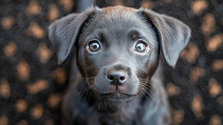 Wide-eyed black puppy stars curiously into the camera with a soft expression and detailed fur.