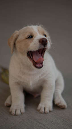 The puppy is sitting and Yawning