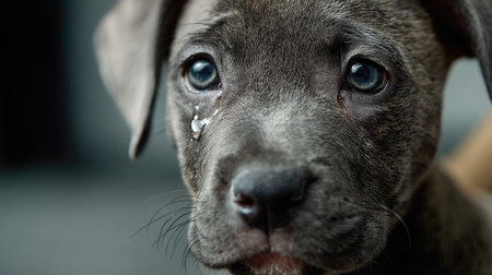 A close-up portrait of an adorable puppy with a tear in its eye, capturing the essence of innocence and emotion against a soft background.
