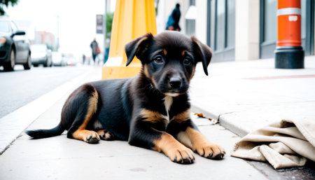A young black and tan puppy looks up with innocent eyes while lying on an urban sidewalk next to a burlap sack.. AI Generation
