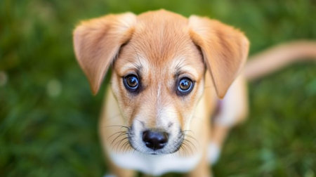 Cute purebred puppy sitting outdoors, looking at camera with selective focus generated by artificial intelligence