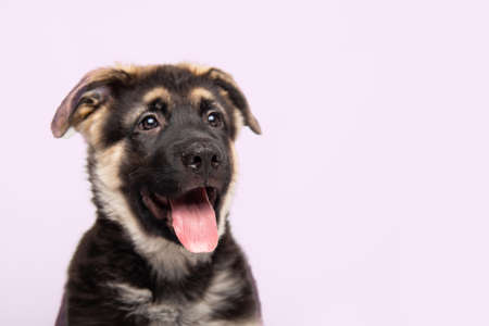 Closeup of face of a puppy German Shepherd dog on pink background. Social Media or web banner with room for text