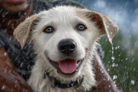Man shakes water off joyful dog in vibrant outdoor scene. Sunlit background highlights playful moment and dog's excited expression. Concept of pet care, animal training, outdoor activities.
