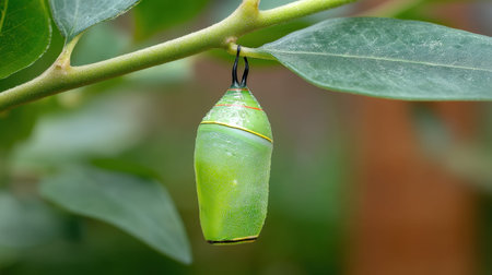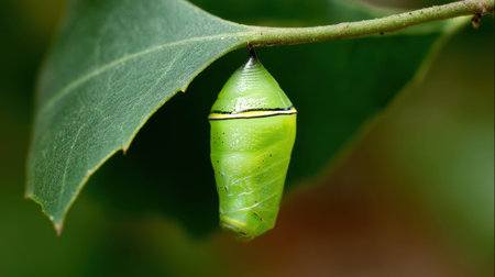 A captivating image of a green chrysalis suspended from a branch, surrounded by lush foliage, showcasing the beauty of nature and the wonder of transformation.
