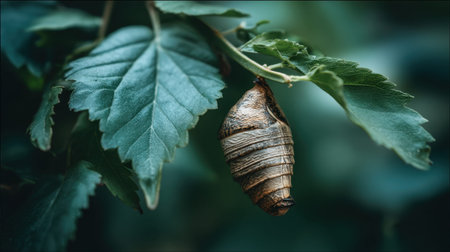 Butterfly chrysalises cocoons hanging, representing transformation and new life