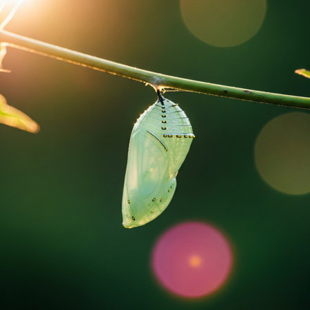 A butterfly slowly comes out of its chrysalis, representing change and transformation in nature during bright spring moments.