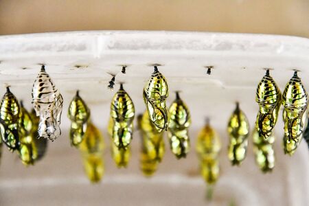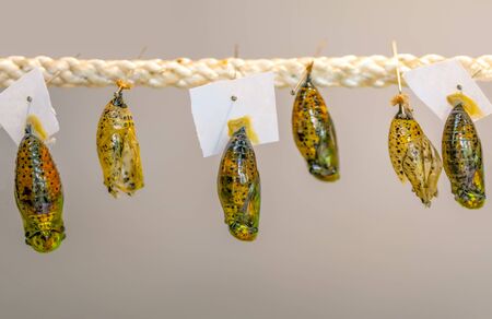 Butterflies farm. Different butterflies chrysalis on a branch