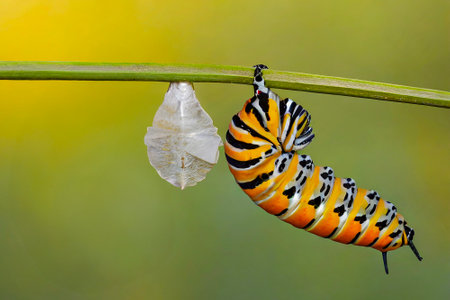 Caterpillar of Common Tiger (Papilio machaon) emerging from chrysalis